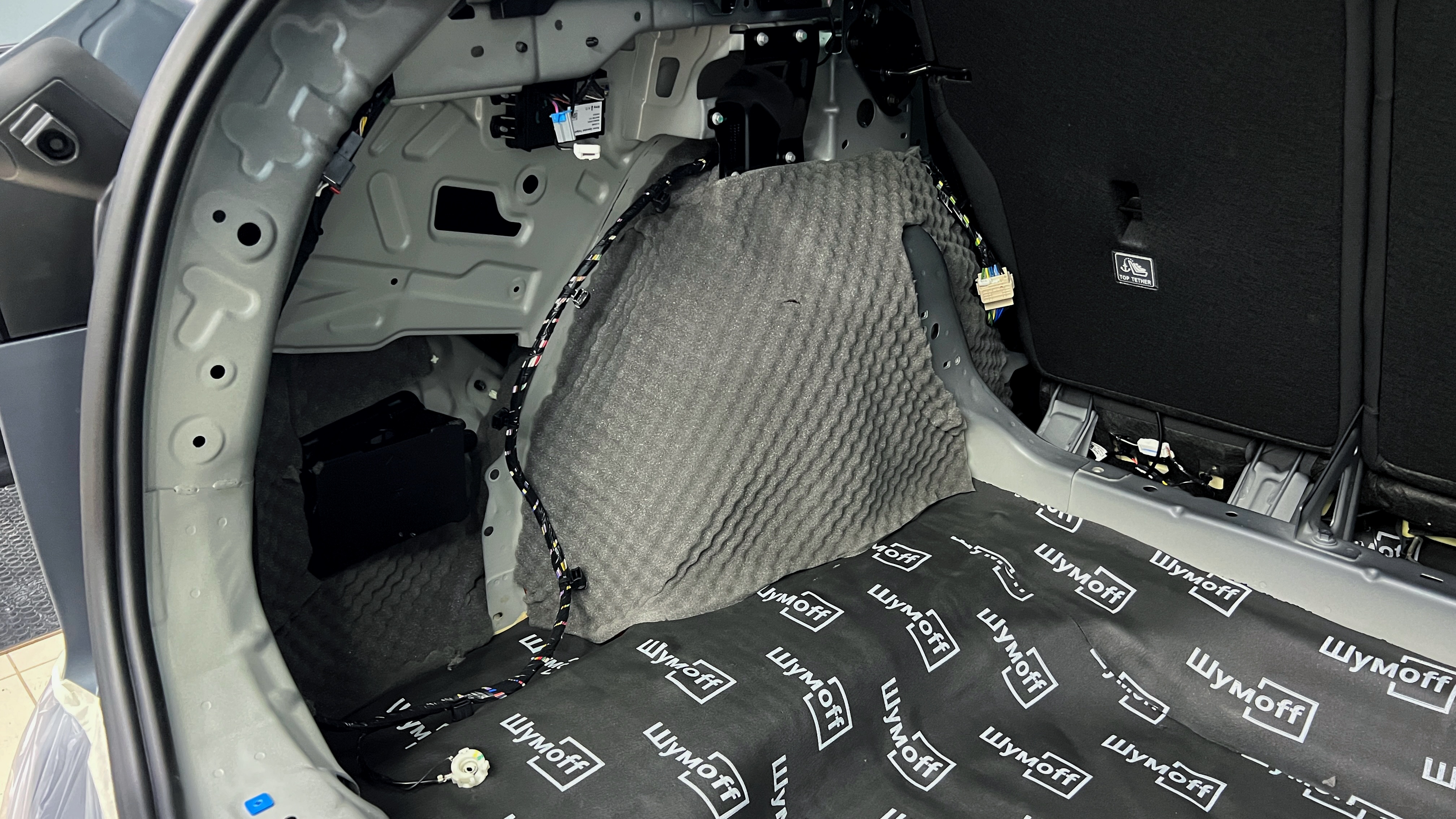 Обезжириваем поверхность и приступаем к монтажу второго слоя. Также для получения более эффективного результата используем компоновку из двух материалов На дно багажника клеим Шумофф Base 4. Этот слой позволит снизить нам шум от дороги.