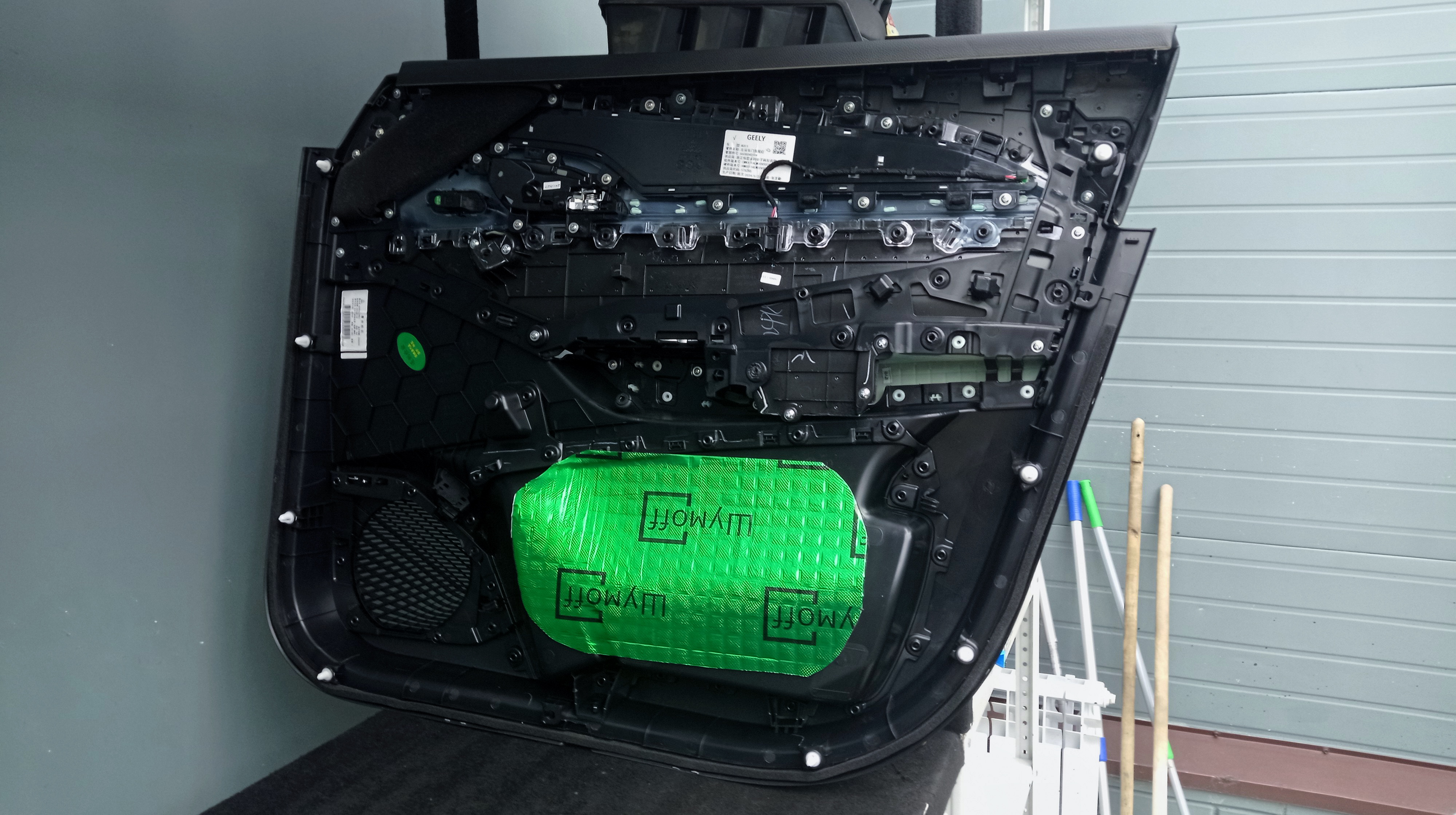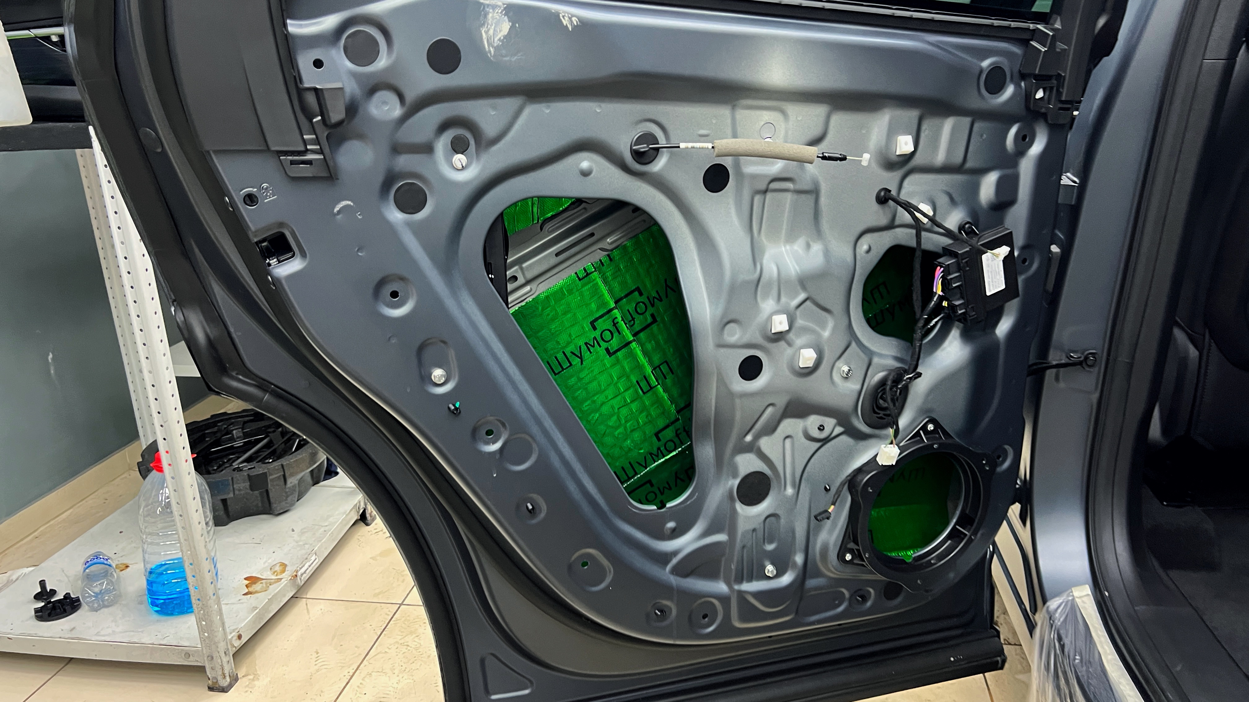 Переходим к оклейке самого корпуса панели, первым слоем частично наносим виброизоляцию Шумофф Joker, создавая тем самым идеальный баланс. Такая частичная оклейка позволит нам чрезмерно не утяжелять панель и придать ей необходимую сбитость