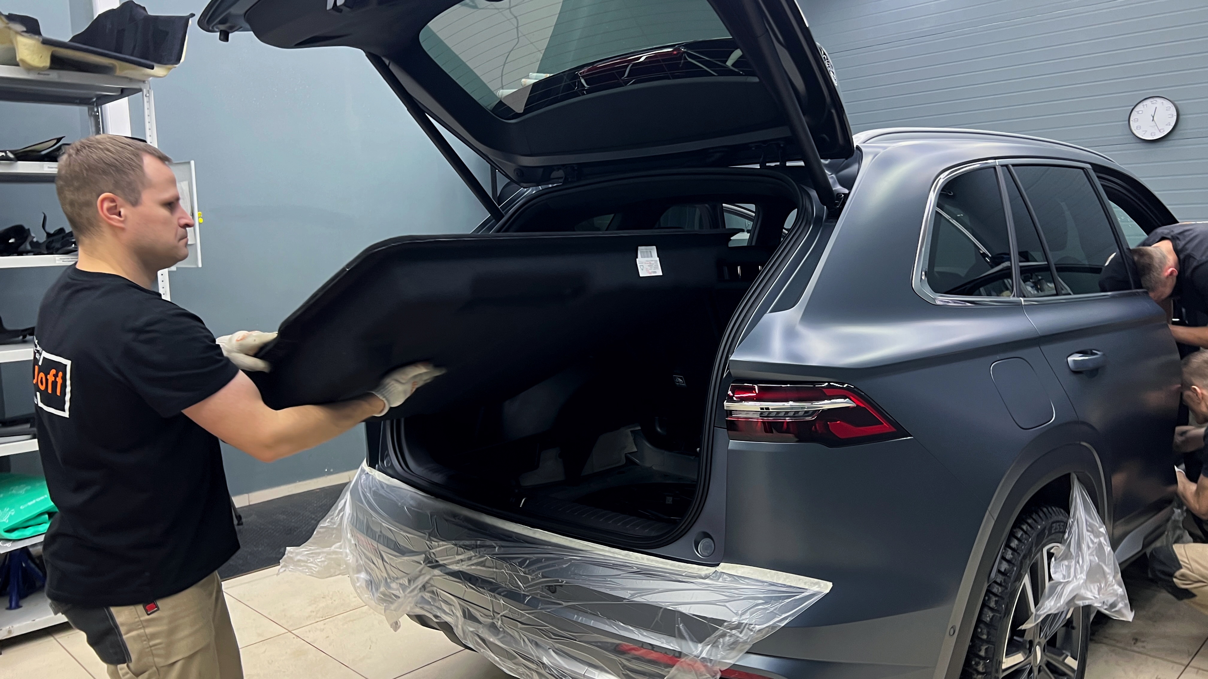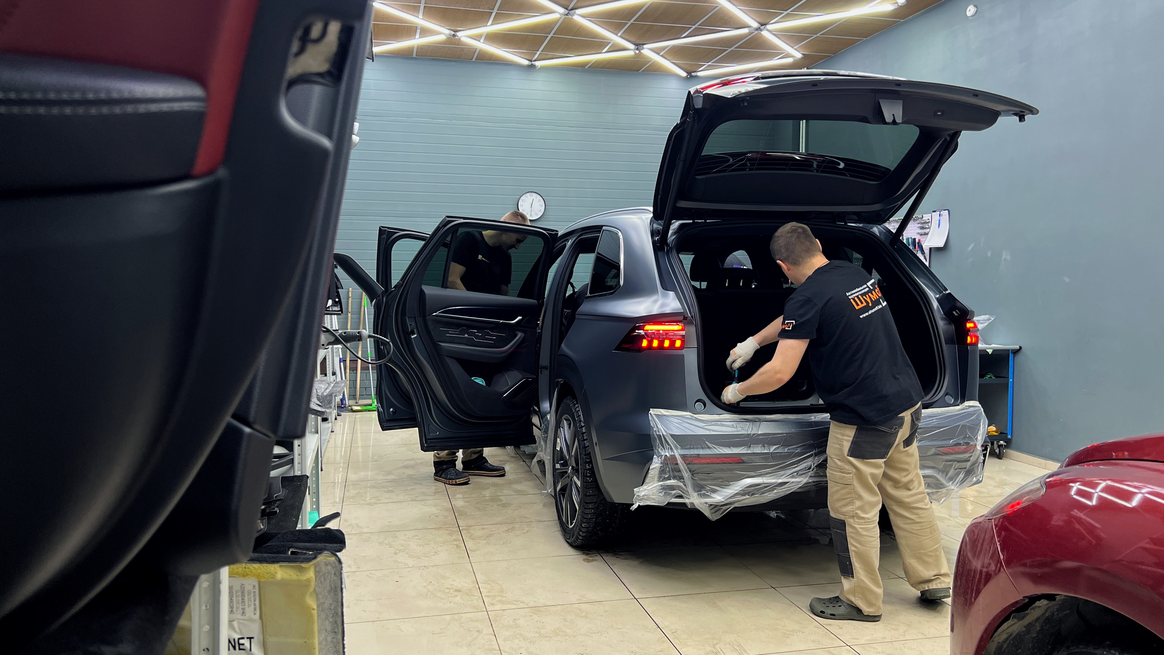 На арки клеим также Шумофф М3, а для крыльев используем менее тяжелый М2. Оклеиваем максимальную площадь багажника за исключением усилителей и ребер жесткости. Данная компоновка материалов позволит идеально достичь нужной эффективности при минимальном увеличении веса, что вместе с виброизоляцией пола также поможет нам снизить вибрацию от дороги, увеличить целостность и сбитость авто.