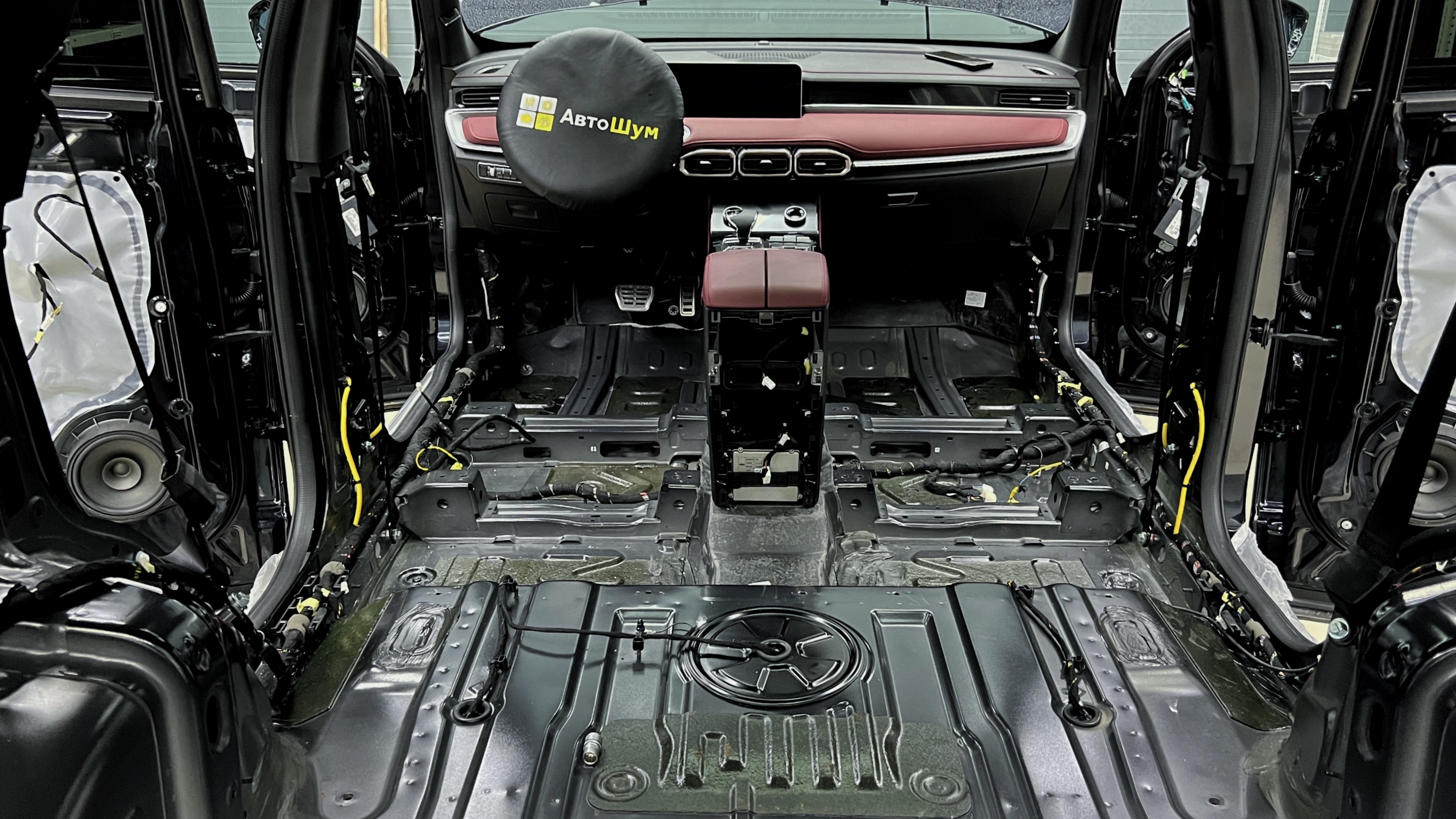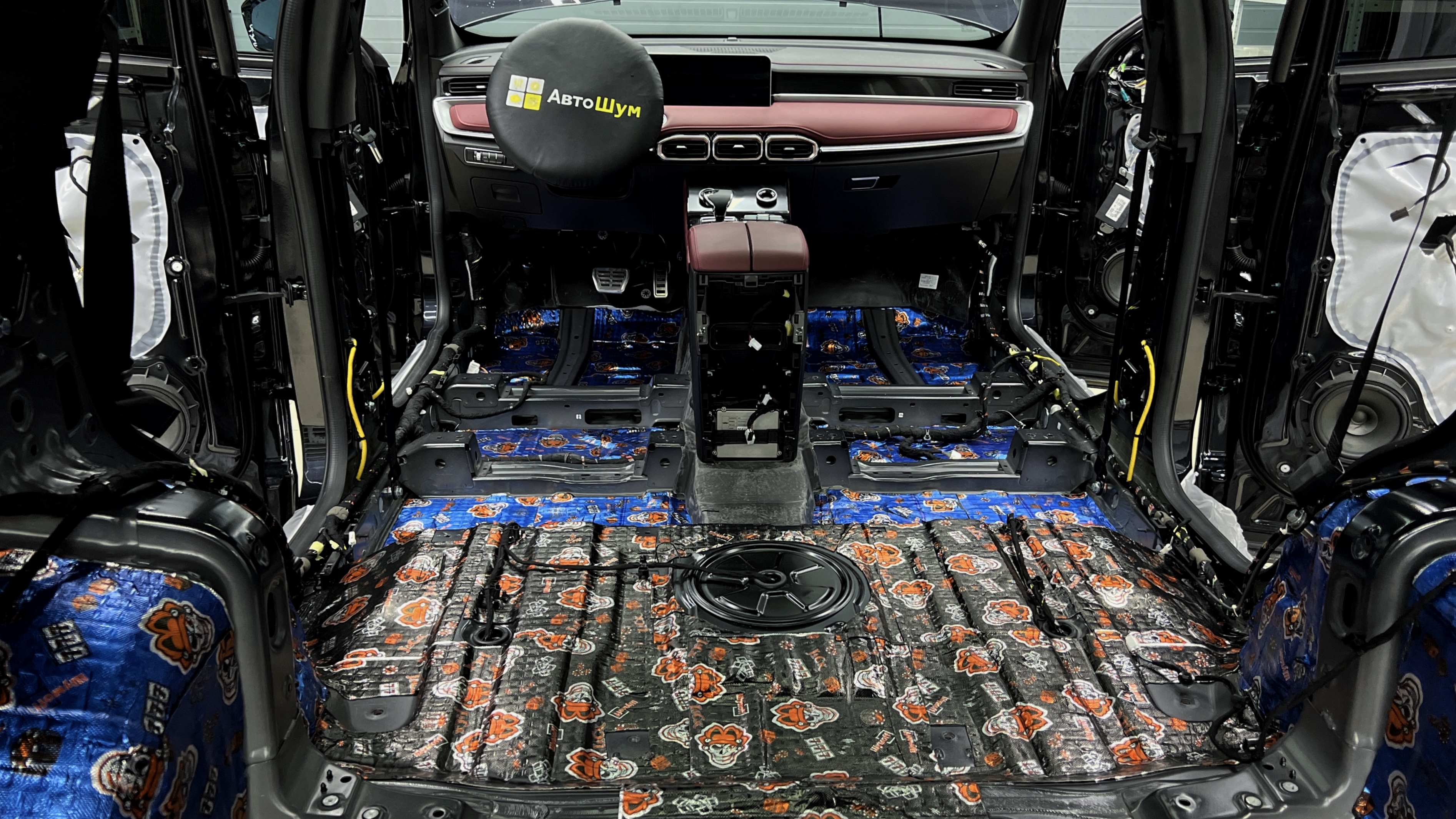 От моторной перегородки и до заднего сиденья вмести с ним клеится мощный многослойный шумо и звукоизолятор Шумофф Prizma 6.