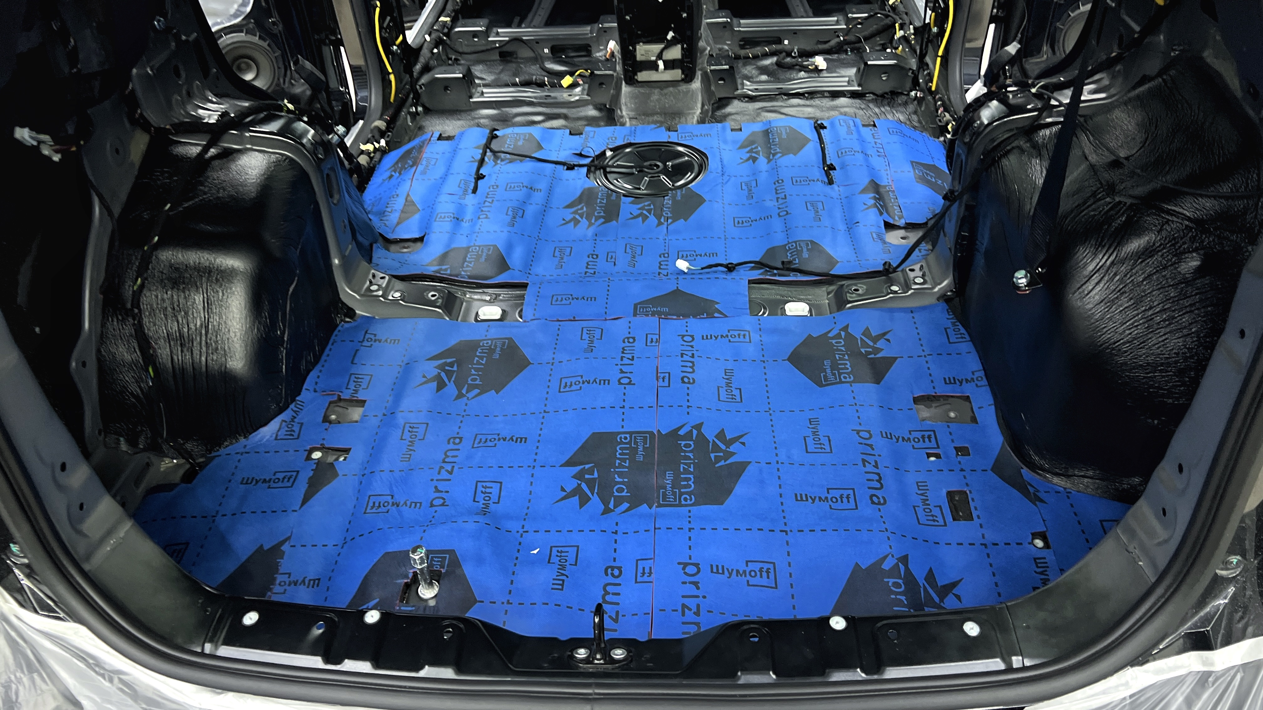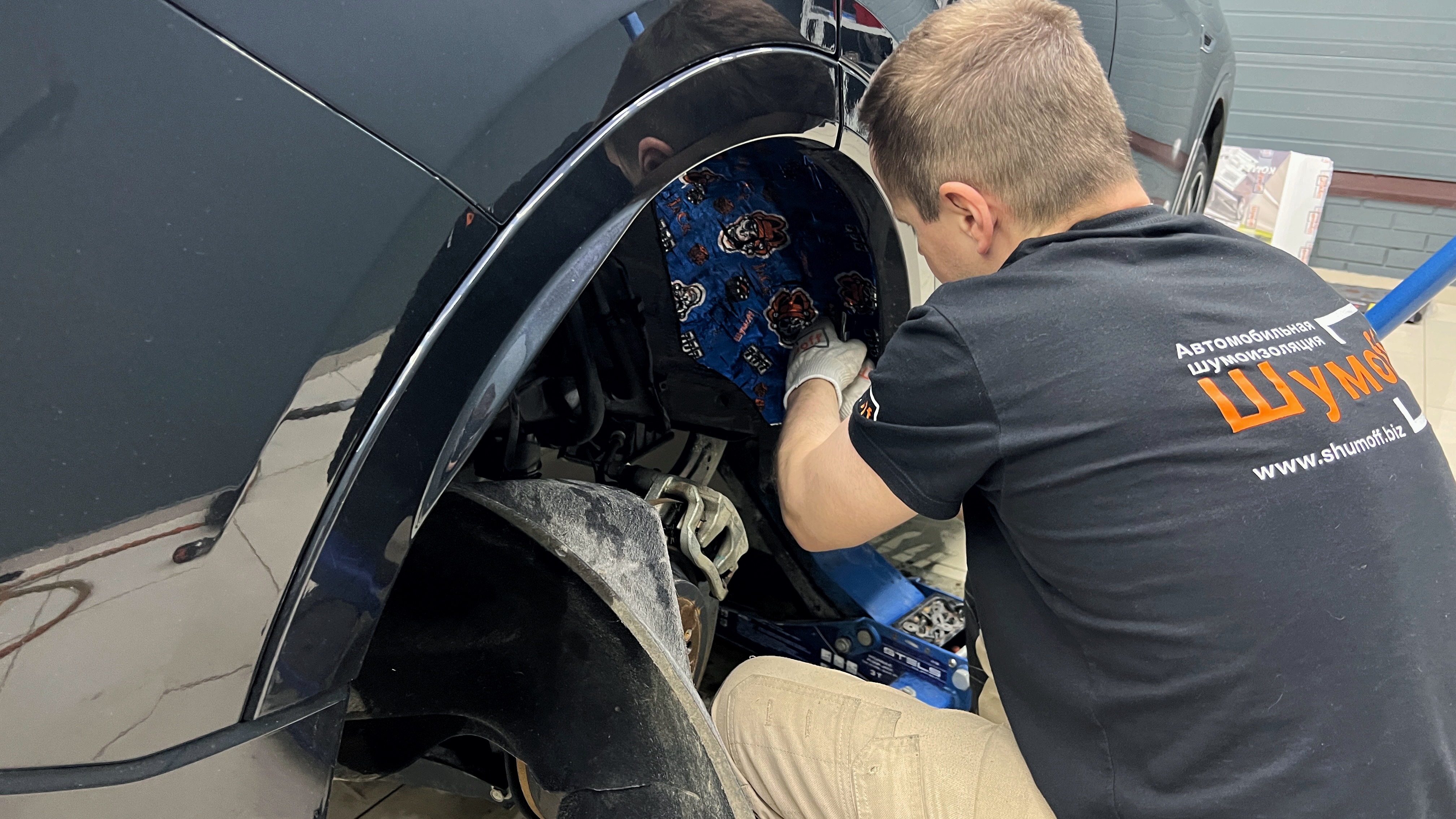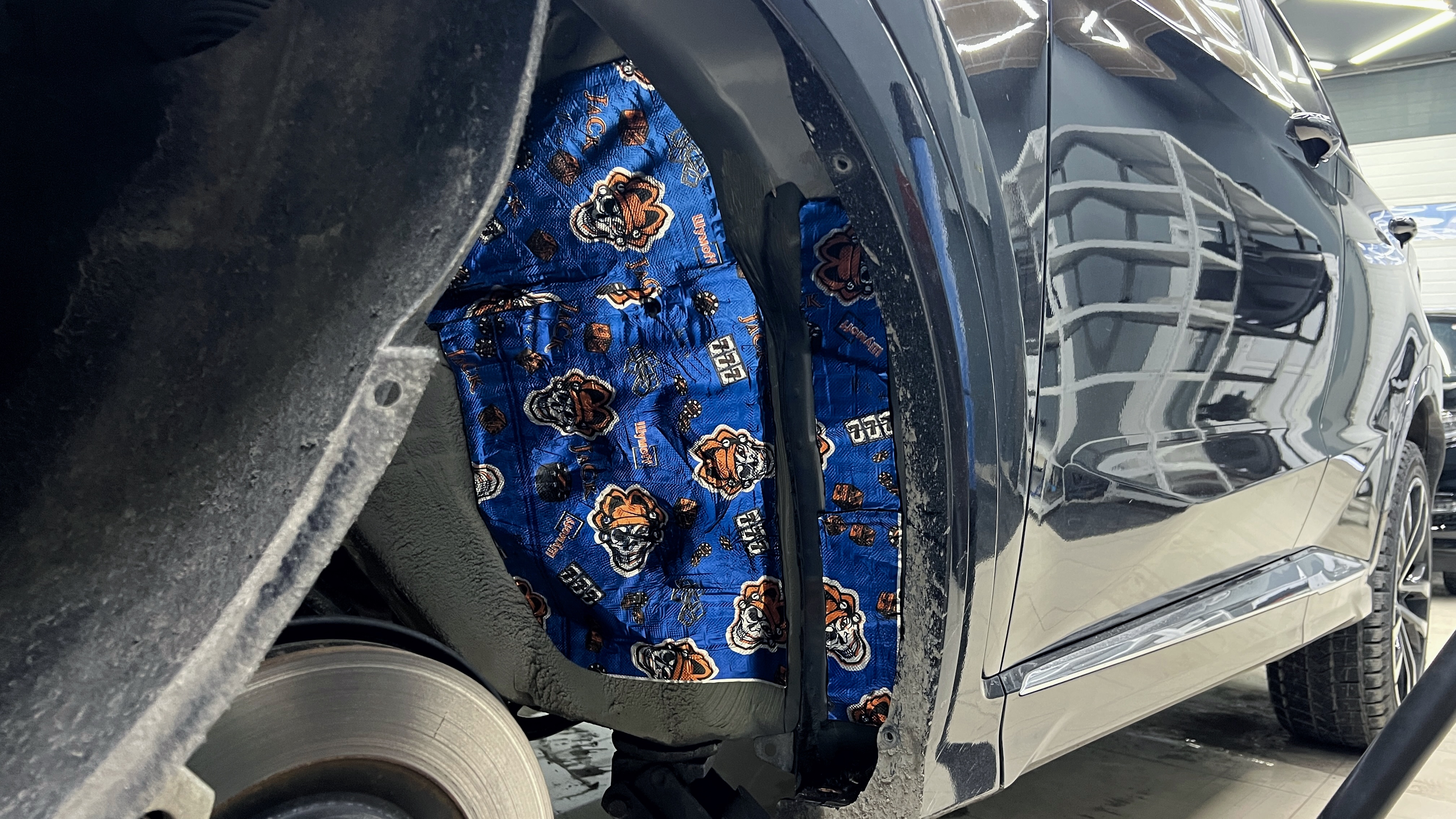 Дно багажника и крылья оклеиваются шумо и теплоизолятором Шумофф П4 4. Арки оклеиваются шумопоглотителем Flex A15.