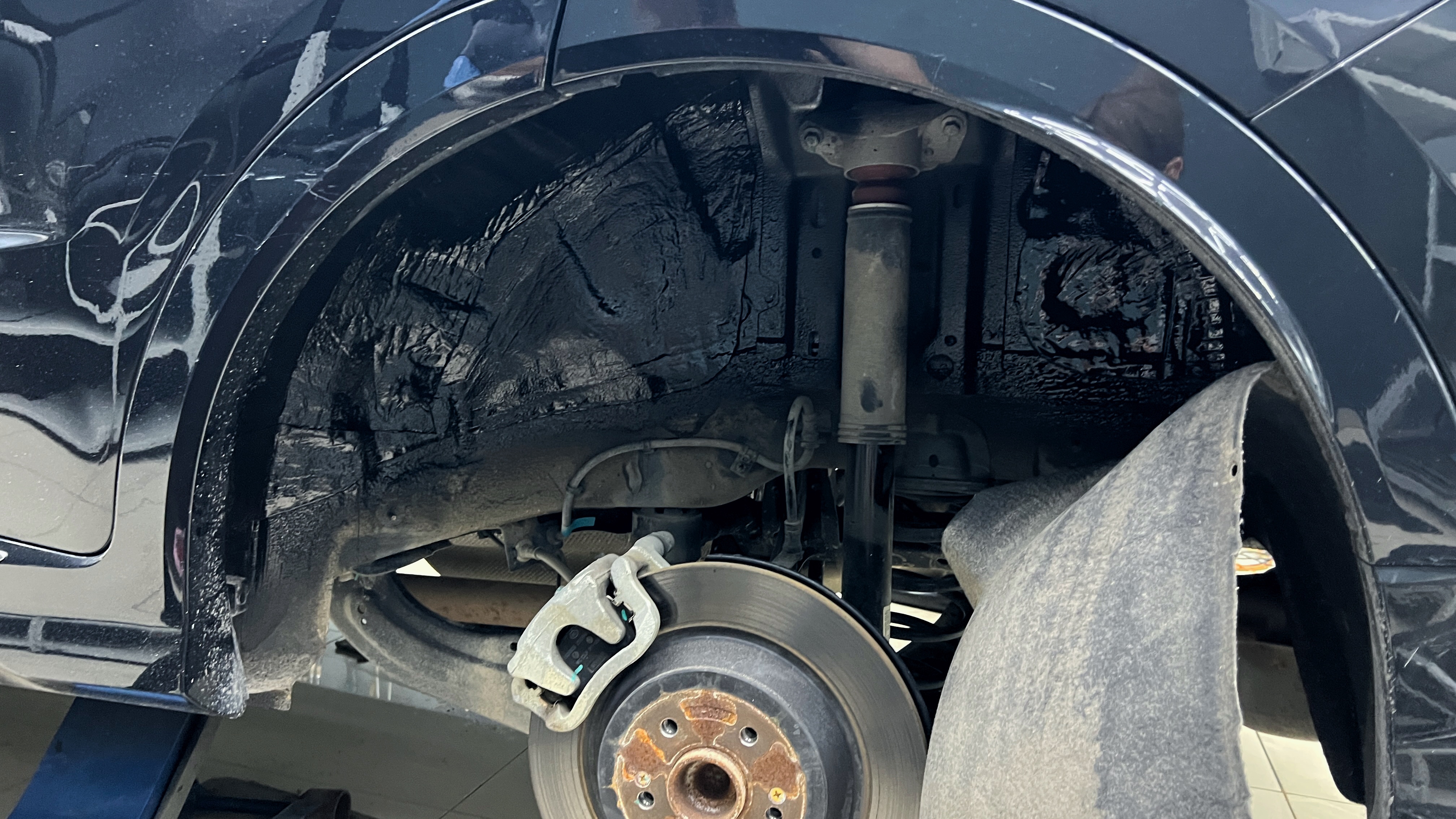 Далее всю оклеенную виброизоляцию покрываем жидкой резиной. Данный слой носит не только эстетический эффект, но и служит отличной защитой. Третьим слоем на подкрылки монтируем виброизоляцию Шумофф Jack. Данный слой отлично устраняет эффект барабана, ведь арки постоянно подвержены воздействиям различных внешних сил, таких как: вода, песок, камни и т.д . Все это, отлетая, создает ощутимые шумы, ведь каждый удар камня создает достаточно шумный резонанс, передающийся в салон. Завершаем шумоизоляцию арок обратной сборкой, устанавливаем подкрылки и колеса на место.