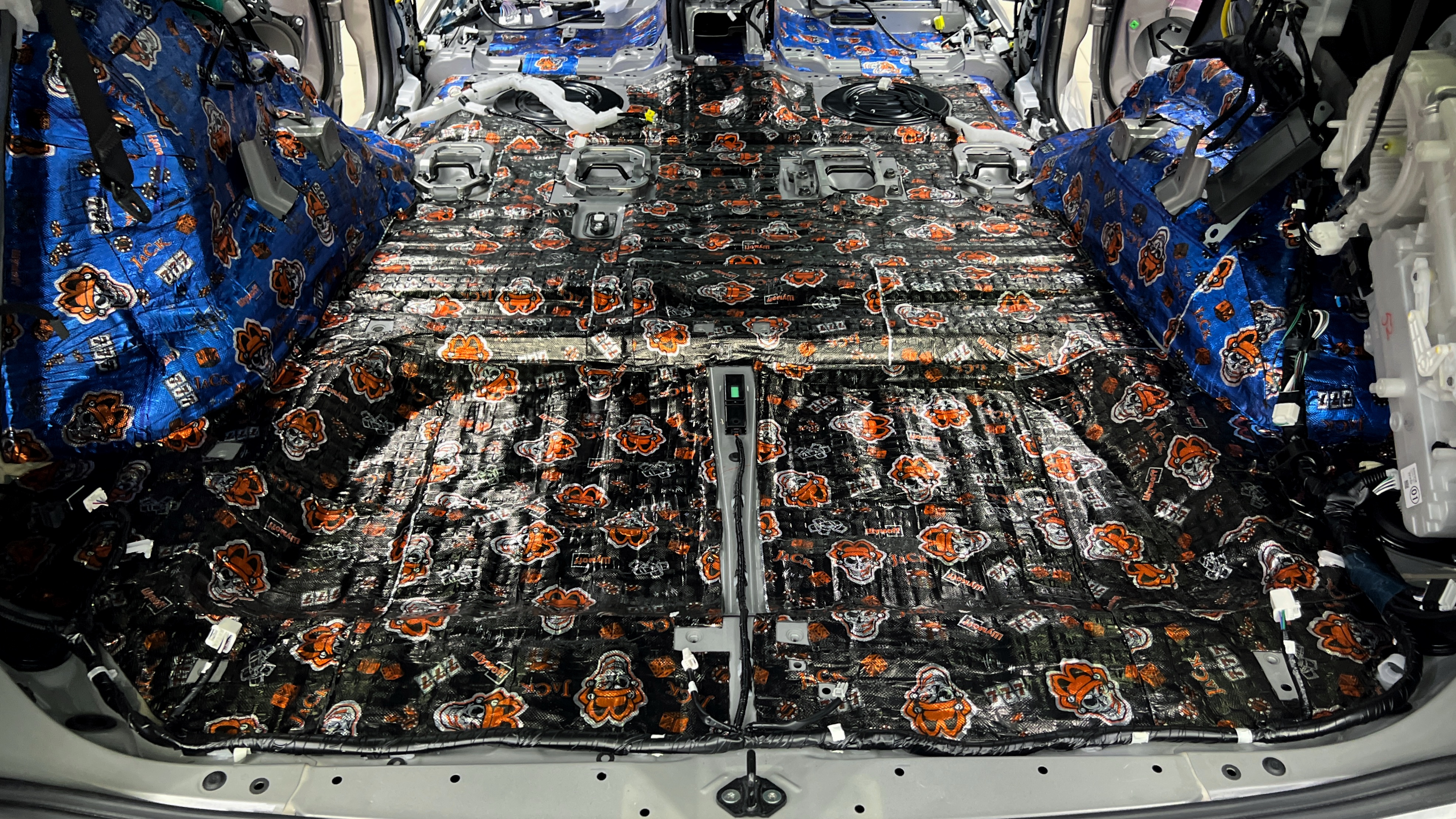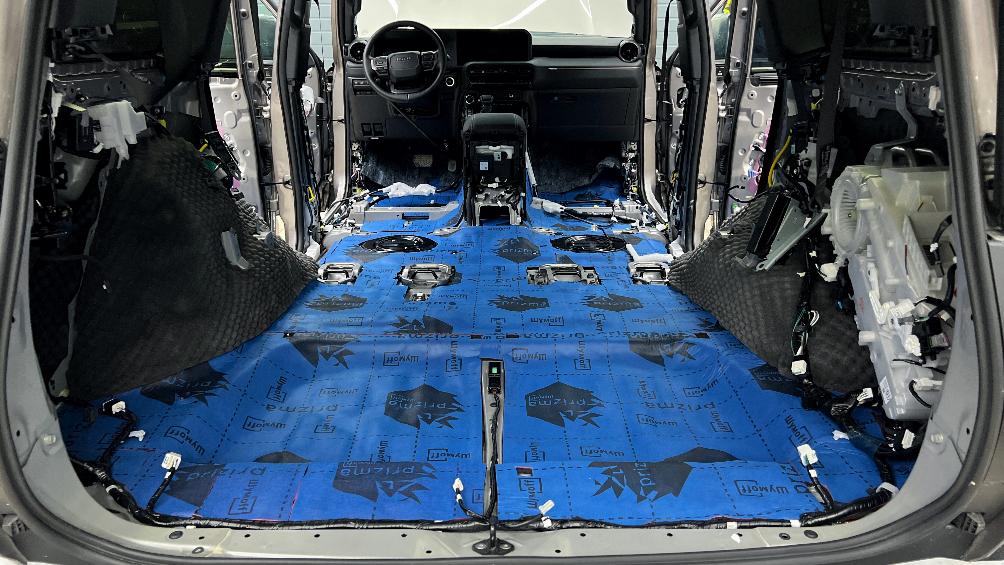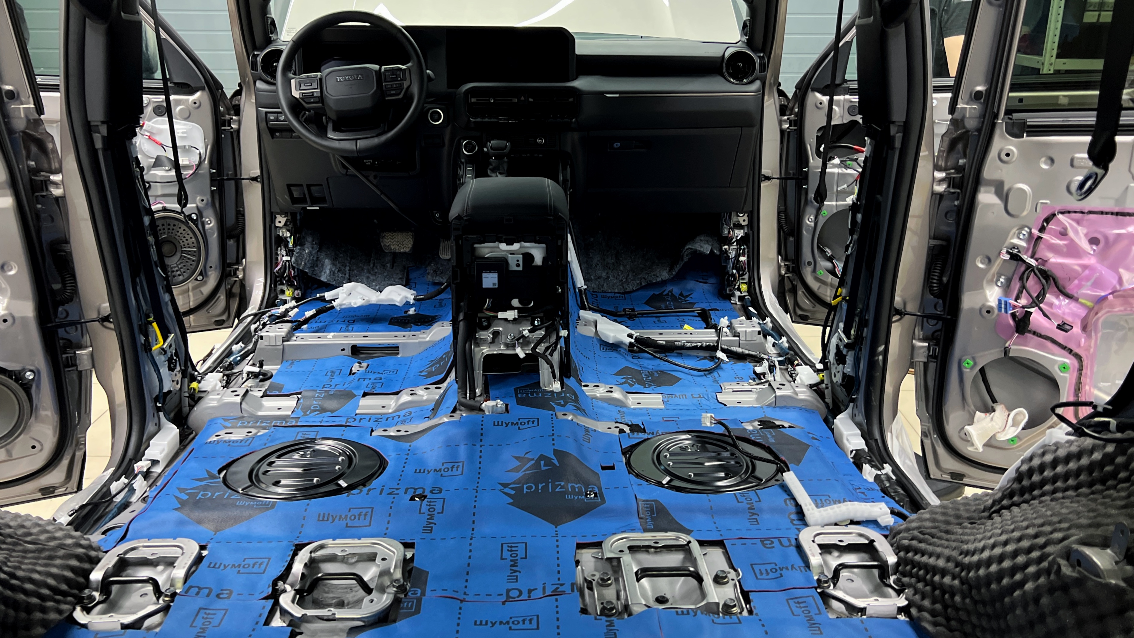 От моторной перегородки и до заднего сиденья вмести с ним клеится мощный многослойный шумо и звукоизолятор Шумофф Prizma 6.